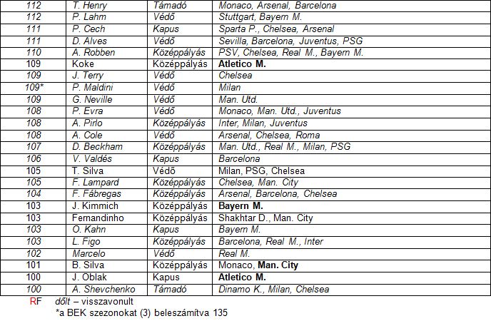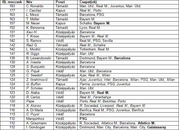 Kihangsúlyozzuk, hogy nem a transfermarkt vagy a worldfootball oldalak adatait vettük figyelembe, hanem kimondottan az UEFA Bajnokok Ligája kézikönyvét, előbbiek ugyanis előszeretettel számolják a selejtezőket is…