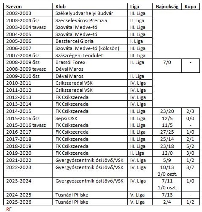 A történet ezt követően még négy és fél évig a FK Csíkszereda színeiben folytatódott és ért véget. Rengeteg góllal, egy nagyszerű kupameneteléssel és történelmi második ligába való feljutással. Közben szépen járta a lépcsőfokokat edzőként is. Vezette az FK U17-es csapatát is a csíki örökös gólkirály, majd a felnőtt csapat másodedzői teendőit látta és látja el segítve a mindenkori edzők munkásságát Suciu Valentintől kezdve Ilyés Róbertig. Ami a játékospályafutásának további szakaszát illeti: előbb a Gyergyószentmiklósi Jövő FC-vel nyert három megyei bajknoki címet és segítette a harmadosztályba jutni a csapatot, majd a ’24-’25-ös idényt a Tusnádi Piliske csapatánál kezdte meg, s ahogy egyre terebélyesedő szakmai elfoglaltsága engedi szórja a gólokat a körzeti bajnokságban is. Legjobb tudomásom szerint eddig 7 mérkőzésen 13 gólt szerzett. A ’25-’26-os szezonban is meglőtte már az első mesterhármasát a 7. fordulóban.