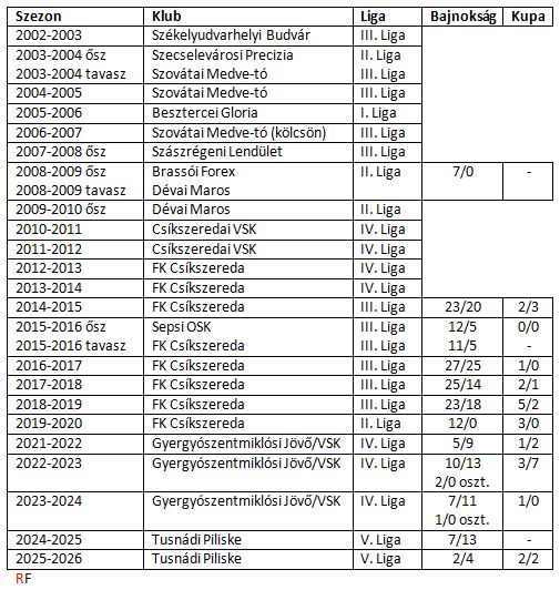 A történet ezt követően még négy és fél évig a FK Csíkszereda színeiben folytatódott és ért véget. Rengeteg góllal, egy nagyszerű kupameneteléssel és történelmi második ligába való feljutással. Közben szépen járta a lépcsőfokokat edzőként is. Vezette az FK U17-es csapatát is a csíki örökös gólkirály, majd a felnőtt csapat másodedzői teendőit látta és látja el segítve a mindenkori edzők munkásságát Suciu Valentintől kezdve Ilyés Róbertig. Ami a játékospályafutásának további szakaszát illeti: előbb a Gyergyószentmiklósi Jövő FC-vel nyert három megyei bajknoki címet és segítette a harmadosztályba jutni a csapatot, majd a ’24-’25-ös idényt a Tusnádi Piliske csapatánál kezdte meg, s ahogy egyre terebélyesedő szakmai elfoglaltsága engedi szórja a gólokat a körzeti bajnokságban is. Legjobb tudomásom szerint eddig 7 mérkőzésen 13 gólt szerzett. A ’25-’26-os szezonban is meglőtte már az első mesterhármasát a 7. fordulóban.