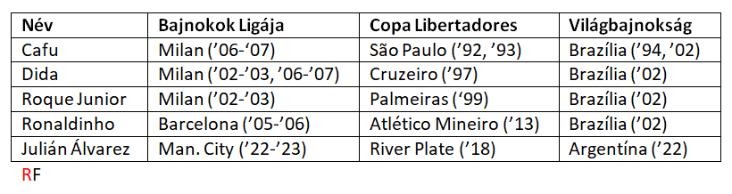 A Manchester City BL-győzelme kapcsán került a listára az argentin támadó, Julián Álvarez, hiszen addigra már zsebében volt a Libertadores Kupa és vb-t is nyert Argentínával. Előtte viszont olyan brazil nagyságok sajátították ki ezt az igen veretes listát, mint Cafu, Dida és Ronaldinho. Véleményem szerint Roque Juniort vétek lenne nagyságként aposztrofálni, de tény, hogy 1999-2003 között bizony ő is magasba emelhette ezt a szóban forgó három komoly trófeát.