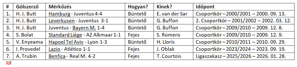 Hans-Jörg Butt (német) – 62/3 – három különböző klubban (Hamburg, Leverkusen, Bayern) szerzett gólt, érdekes módon mind a Juventusnak (egyet Edwin van der Sar kapujába, kettőt Gianluigi Buffonnak), mindhárom gólja büntetőből született, ami természetesen rekord a sorozatban. Gyakorlott büntetőrúgó volt.